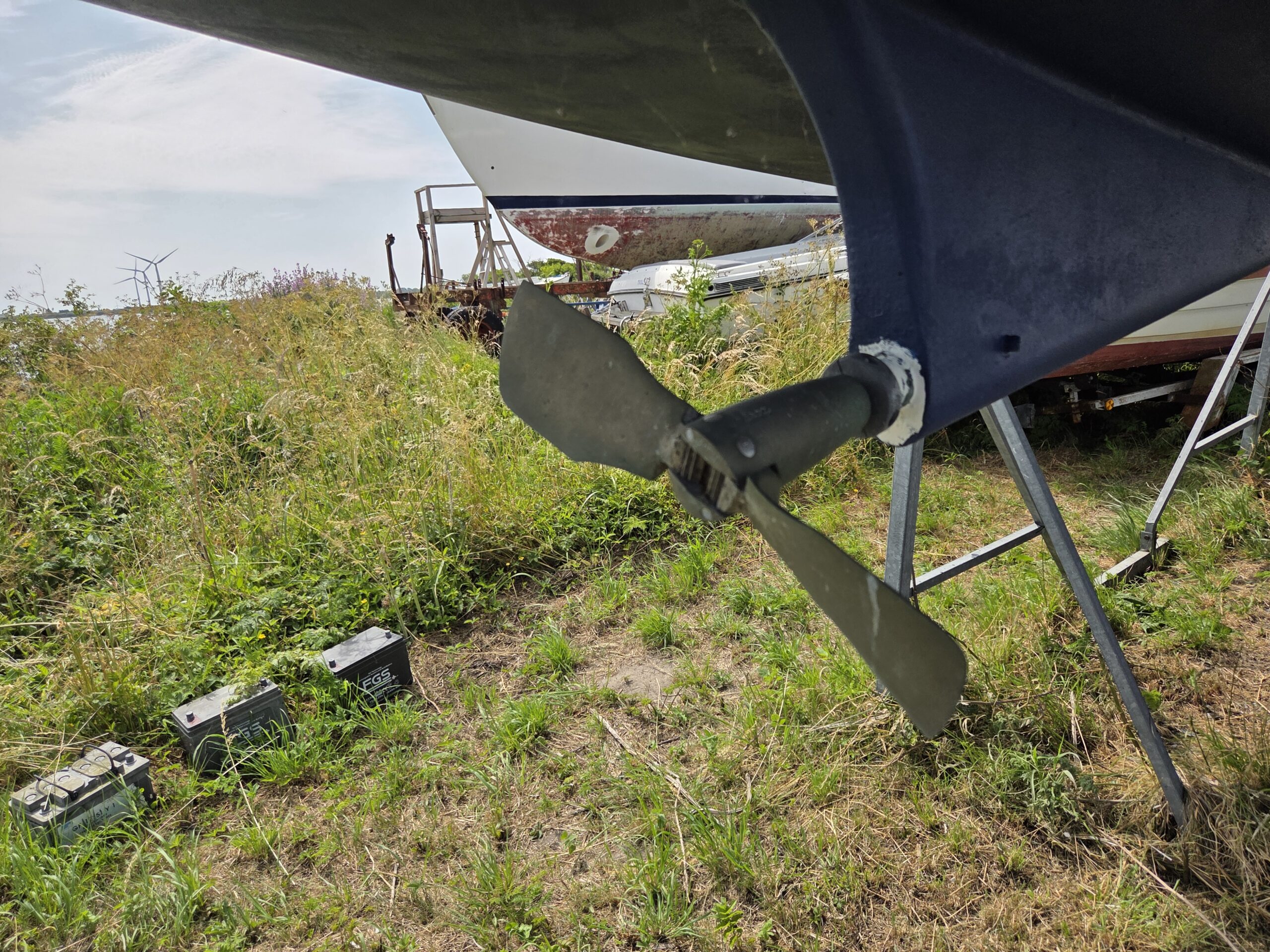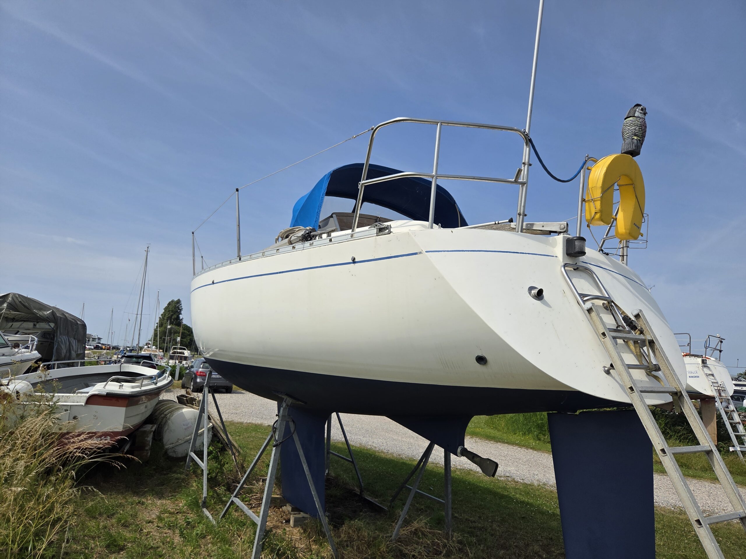 Båden ligger på land i Nakskov. Hestehoved lystbådehavn.